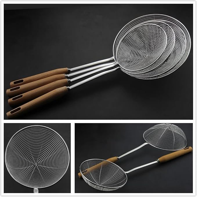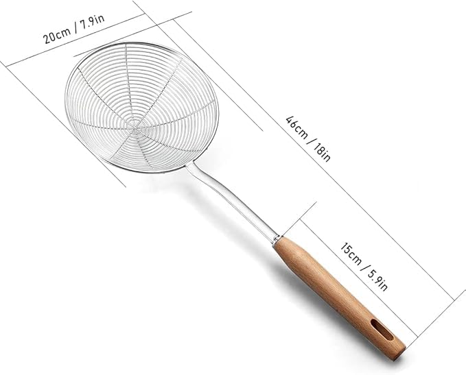 Generic - مصفاة عنكبوتية من الستانلس ستيل، مصفاة كبيرة 20 سم بمقبض خشبي، مغرفة مطبخ للطبخ وفلترة الزيت