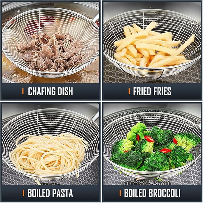 - استخدام متعدد الاستخدامات: مثالي للقشط والتصفية وترشيح الزيت أثناء الطهي، مناسب للقلي العميق والتبييض وإزالة الطعام من الماء المغلي