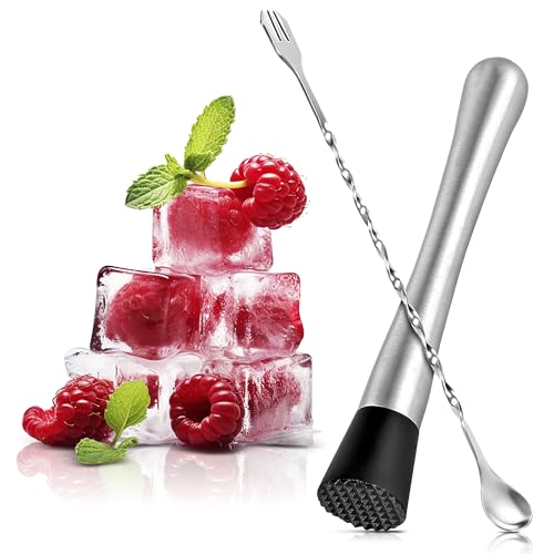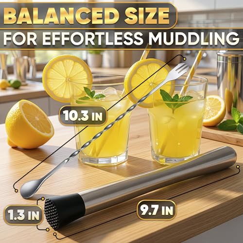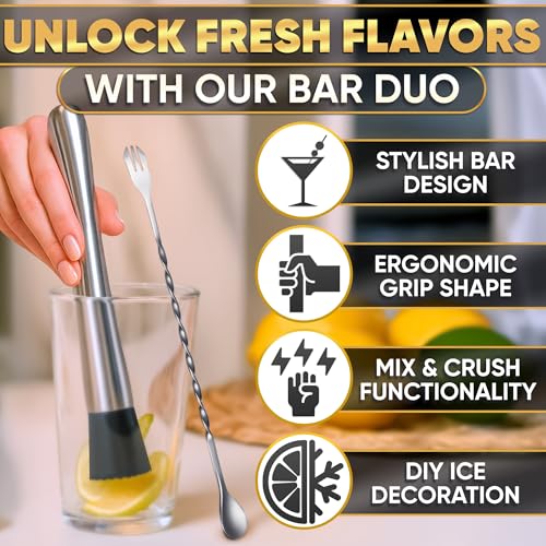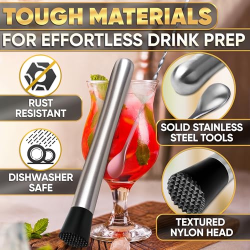 Lagarto - مجموعة ملعقة تقليب وأداة خلط من الفولاذ مقاوم للصدأ للكوكتيل، طقم كوكتيل بتصميم كلاسيكي وكسارة الثلج وملعقة خلط الكوكتيل، كسارة الفاكهة ومزيج الموخيتو والكوكتيل، ملحقات بار القهوة