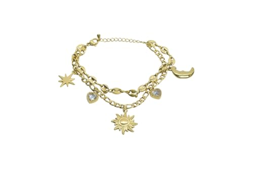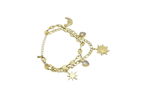 Generic - سوار متعدد الطبقات من الستانلس ستيل بتصميم شمس وقمر ونجوم مع دلايات على شكل قلب للنساء - ذهبي