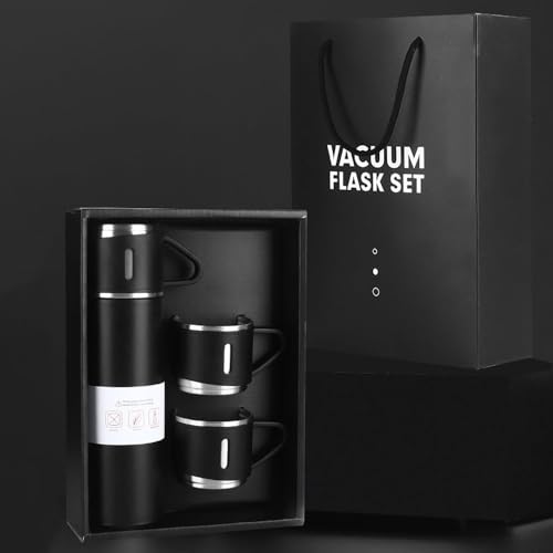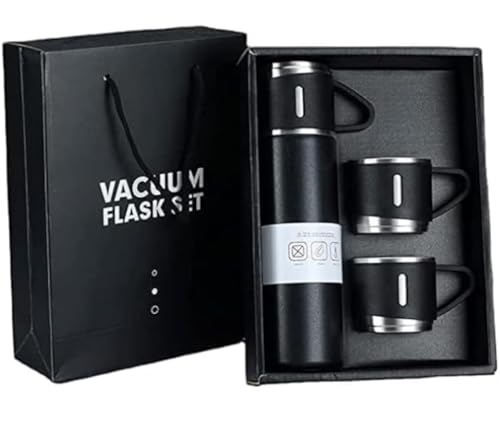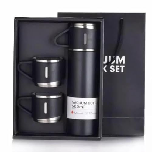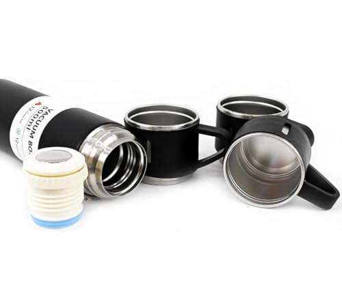 Spaceshoop - ترمس من الفولاذ المقاوم للصدأ سعة 500 مل، زجاجة معزولة بتفريغ الهواء مع 3 أكواب للمشروبات الساخنة/الباردة (أسود)