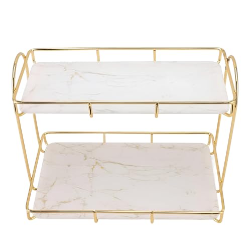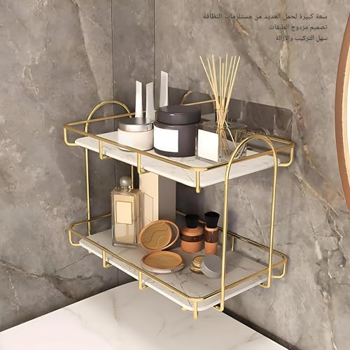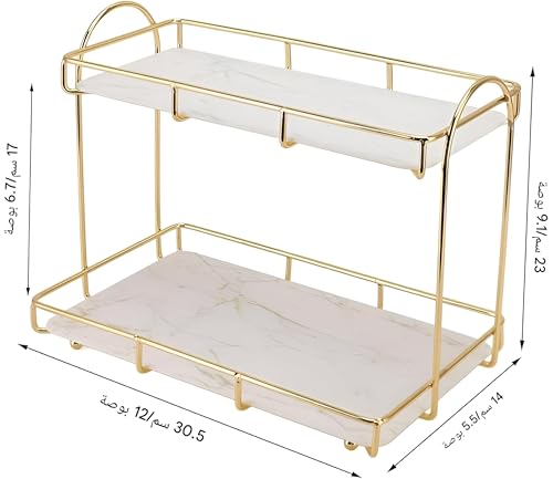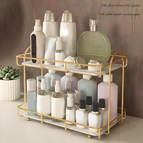 Generic - حامل - شاشة عرض معدنية ذهبية مصممة لمستحضرات التجميل والعطور والعناية بالبشرة واكسسوارات الاستحمام، كما أنها عملية كرف توابل مع صينية رخامية خشبية لتعزيز مساحات التخزين العصرية