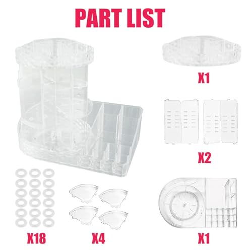 - تجميع هذا المنظم بسيط وسريع لأنه يتكون من 8 أجزاء مؤمنة بـ 16 حلقة مطاطية. الدوران السلس 360 درجة وسعة التخزين الكبيرة تجعله ليس عمليًا فحسب، بل أيضًا اختيار هدية مدروس للنساء اللواتي يقدرن الجمال والنظام والعملية في روتينهن اليومي.