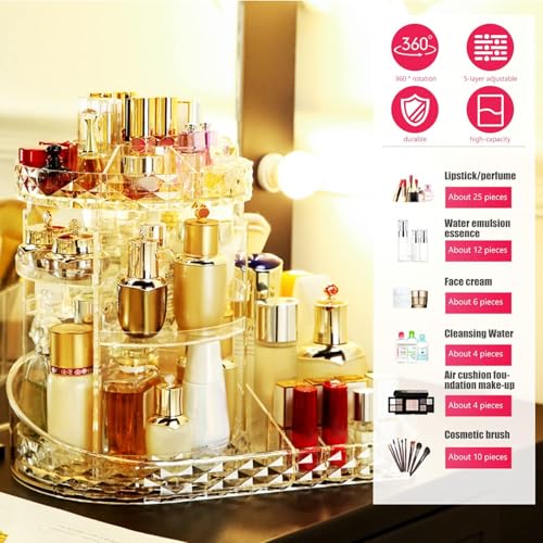 - يتميز منظم المكياج الدوار هذا بثلاثة أرفف واسعة، مصممة لحمل ما لا يقل عن 30 فرشاة مكياج و20 منتجًا للعناية بالبشرة وملحقات مختلفة مثل طلاء الأظافر وكريم الأساس ومحدد العيون ومنظفات الوجه. تضمن سعتها الكبيرة أن تبدو طاولة الزينة وطاولة الزينة أنيقة ومرتبة دائمًا دون أي فوضى.
