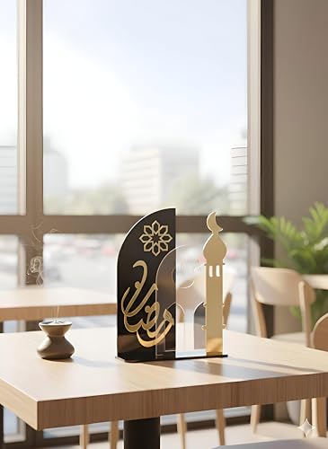 Generic - حامل بتصميم مئذنة وهلال - حامل اكريليك ذهبي واسود انيق مع هلال، تصميم من 3 قطع، صناعة عالية الجودة، عنصر أساسي لديكور رمضان