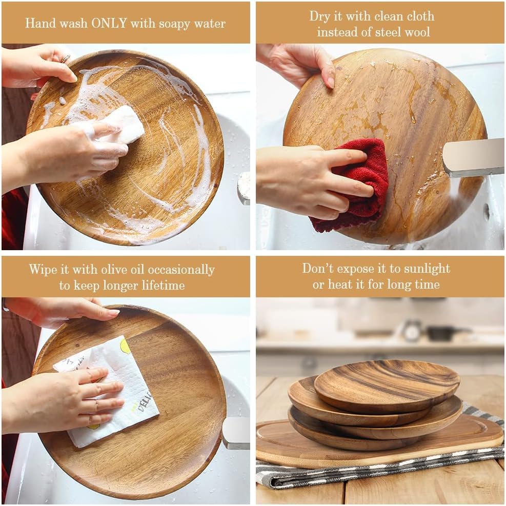 - سهلة التنظيف: نظرًا لأن مجموعة الأطباق الخشبية هذه مصنوعة من الخشب الطبيعي بنسبة 100%، فليس من الآمن وضعها في غسالة الأطباق. يجب غسل الأطباق الخشبية يدويًا وتجفيفها بسرعة لإطالة فائدتها.