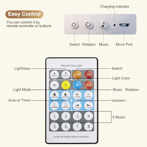 - 【جهاز تحكم عن بعد】يتيح لك جهاز التحكم عن بعد التحكم إمكانية التحكم في جهاز عرض النجوم الليلي عن بعد. كما يمكنك ضبط مستوى صوت موسيقى التهويدة أو تبديل الأغاني أو تغيير مستويات السطوع وأوضاع الإضاءة أو ضبط عداد وقت التشغيل التلقائي. تتيح لك وظيفة عداد الوقت التلقائي ضبط المؤقت لمدة 15 دقيقة و30 دقيقة قبل النوم لتوفير الطاقة بفعالية.
