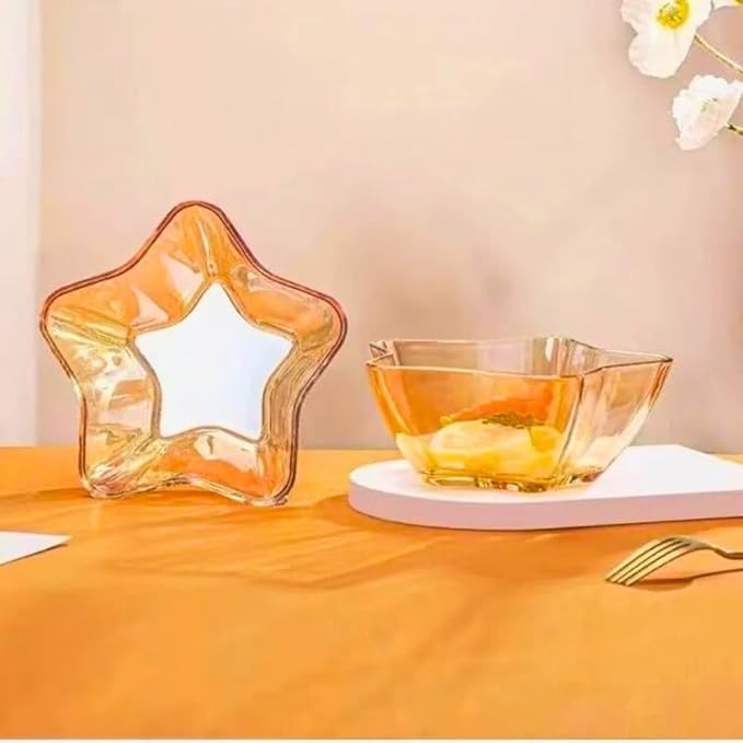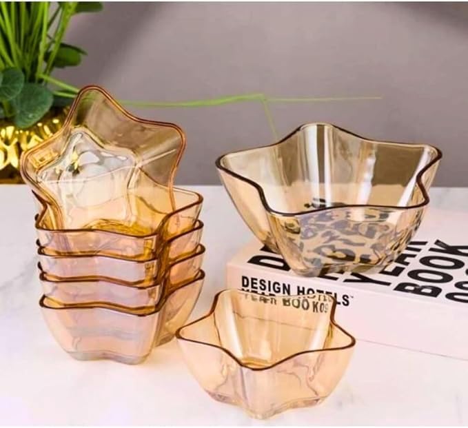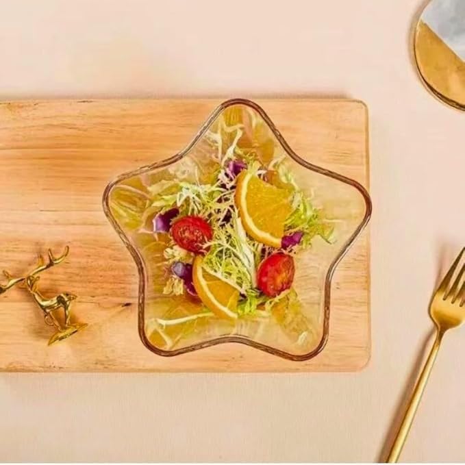 - تصميم أنيق: أوعية تقديم زجاجية على شكل نجمة بلمسة نهائية ذهبية/شفافة جميلة، مثالية لتقديم الوجبات الخفيفة والحلويات والمقبلات
