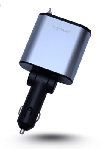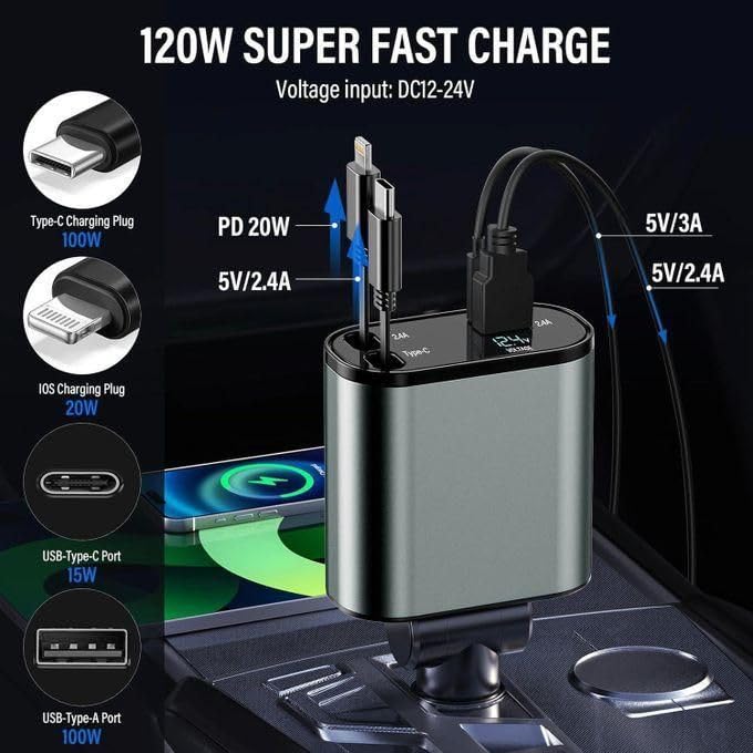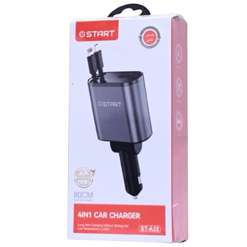 - شاحن سيارة قابل للسحب 4 في1 من START ST-A22، شاحن سيارة 120W ، شاحن موبايل وجهازعرض للسيارة، ولاعة سجائر USB C مع كيبلات 80 سم نوع C و L