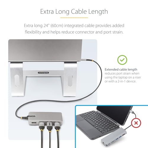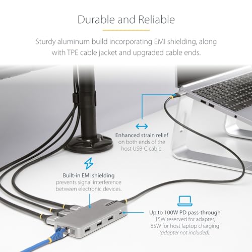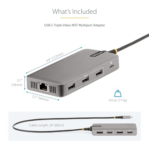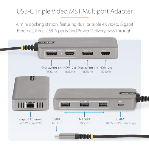 StarTech - محول USB نوع C ثلاثي المنافذ 4K 30Hz+4K 60Hz HDMI ومنفذ عرض، موزع USB 3 منافذ 10GB، 100W بي دي مرور، GB إيثرنت، قاعدة ترافل، ويندوز وكروم او اس (117 بي USB سي-متعدد الموارد)، من ستارتيك دوت كوم