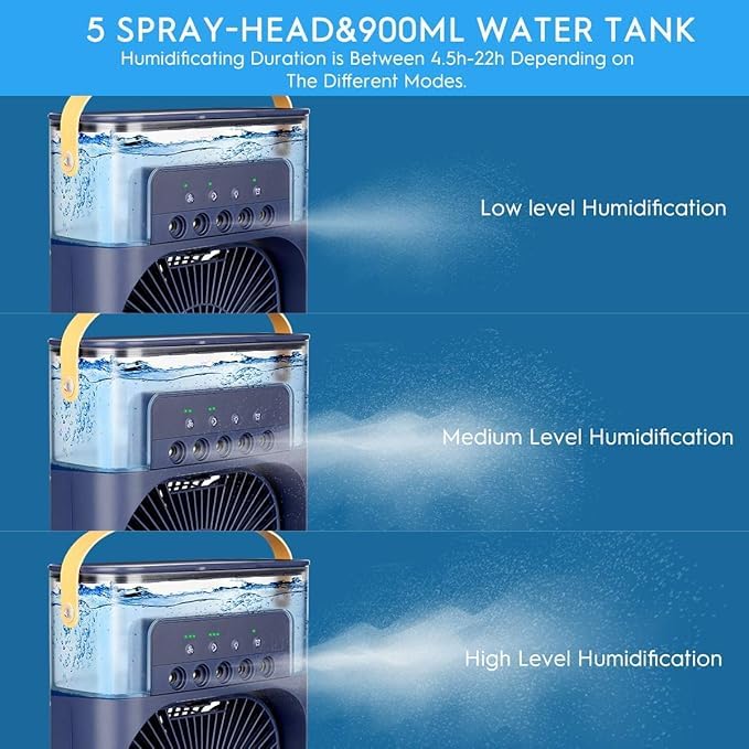 - وظيفة 5 في 1 - تعمل كمروحة تبريد ومرطب وضوء ليلي ودوران هواء ومكيف هواء صغير.