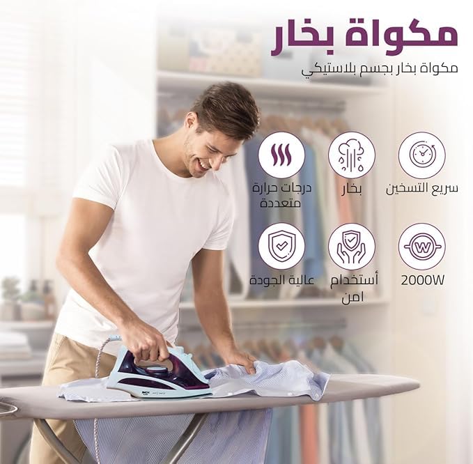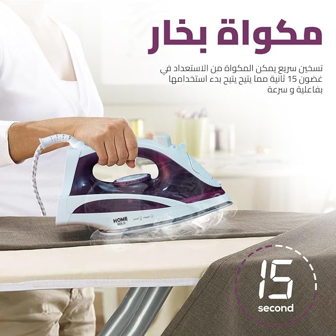 - مكواة بخار قوية للتسخين لمدة 15 ثانية: وفر الوقت مع تسخين سريع لمدة 15 ثانية ومحرك 2000 واط - مثالي للصباح المزدحم أو الإصلاحات السريعة لخزانة الملابس.