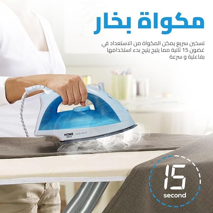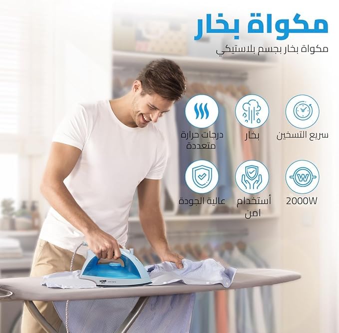 - مكواة بخار قوية 2000 وات من هوم جولد: جرب الكي الفعال مع محرك قوي بقوة 2000 وات، مما يضمن تسخين سريع وأداء ثابت.