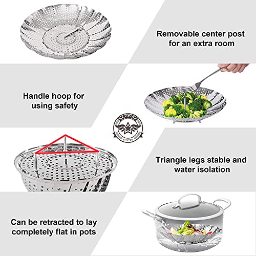 - [مادة عالية الجودة] - سلة البخار القابلة للطي مصنوعة من الستانلس ستيل الآمن غذائيًا، وهو مقاوم للصدأ وغير ضار ومتين. الفتحات الموجودة على سلة البخار لسهولة البخار والتصريف.