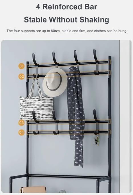 - رف معاطف وأحذية ممتاز متعدد الوظائف مثالي لتنظيم ملابسك وأحذيتك وشنطتك والشماسي والطواقي ومساحة المكتب. كما أنه خيار تخزين رائع لغرفة المعيشة وغرفة النوم والبهو.