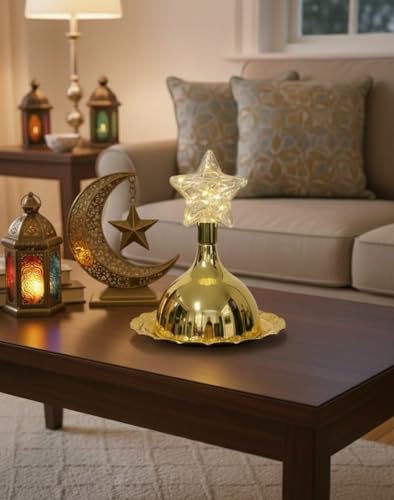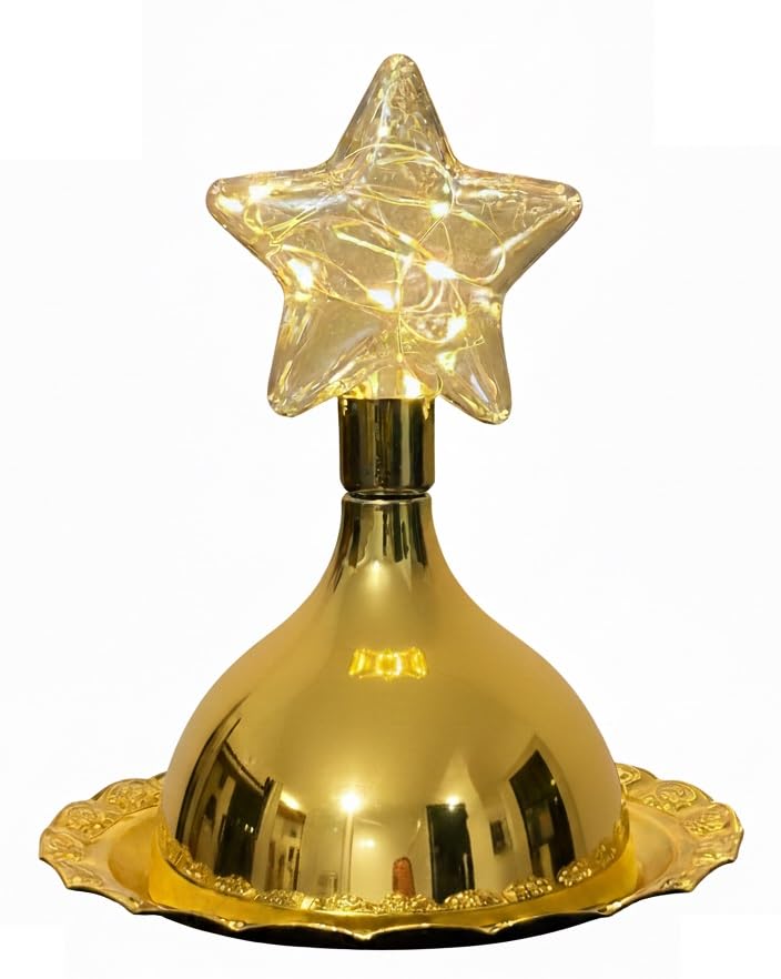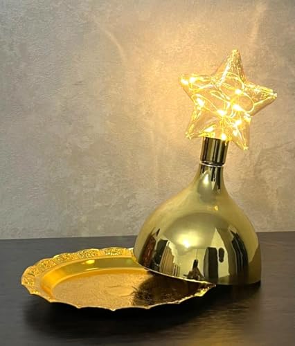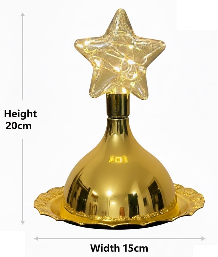 - فانوس مزخرف على شكل قبة مع إضاءة LED يأتي مع صينية معدنية دائرية ذهبية بعرض 15 سم يمكن استخدامه لتقديم التمور والمكسرات واللوز. ويضيف ضوء LED تأثيرات مذهلة إلى الديكورات.