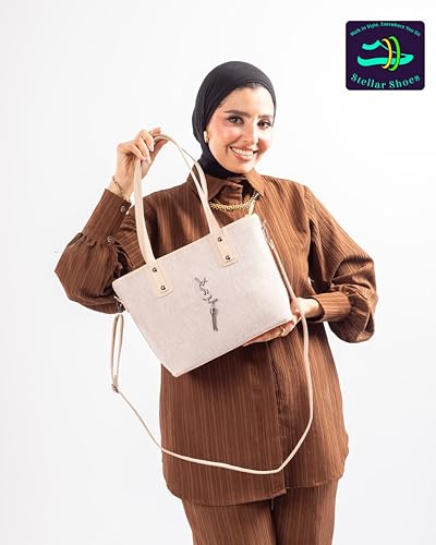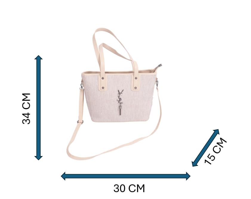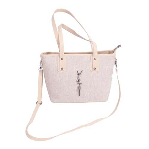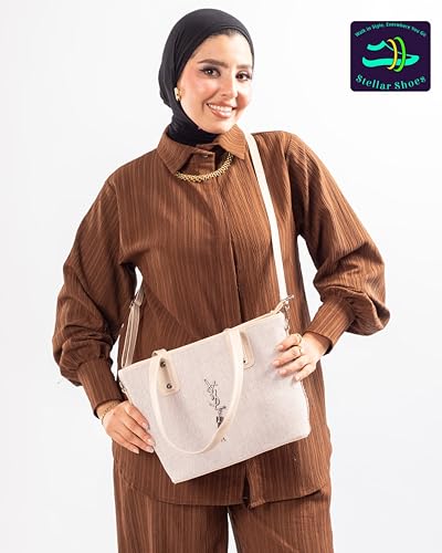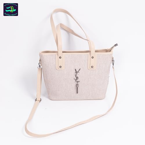 Generic - Stellar حقيبة يد نسائية كلاسيكية، قماش كتان بيج مع تفاصيل جلدية بيج، حجم 34×30×15 سم، حمالات مزدوجة وحزام كتف قابل للتعديل، مثالية للعمل والاستخدام اليومي
