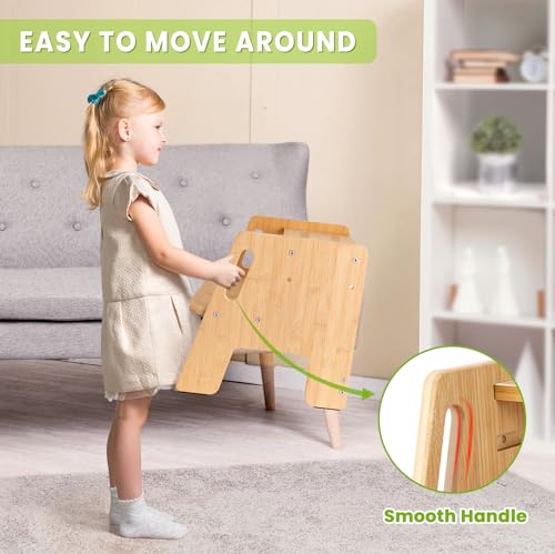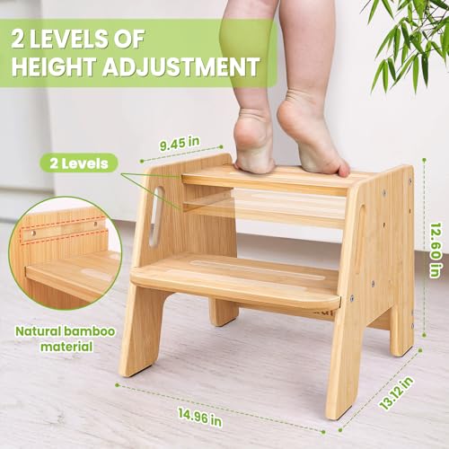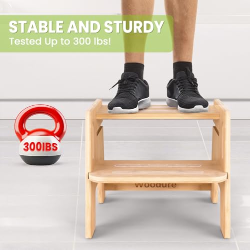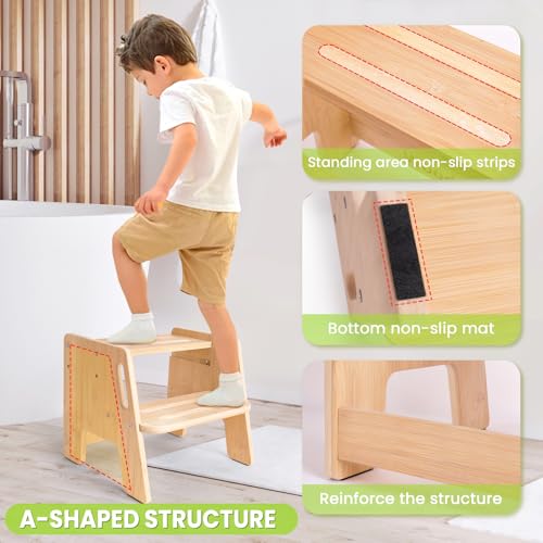 Woodure - كرسي صغير للحمام للأطفال الصغار، مقعد خشبي بارتفاع قابل للتعديل بدرجتين للأطفال، مقعد تدريب على استعمال المرحاض مع مقابض لحوض الحمام والمطبخ وغرفة النوم