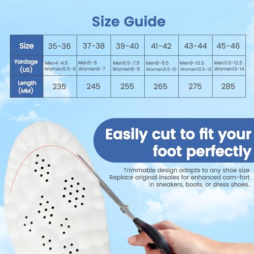 - قابلة للتخصيص ومتعددة الاستخدامات: تم تصميم النعال الداخلية الخاصة بنا ليتم قصها لتتناسب مع مقاس حذائك للحصول على ملاءمة مثالية. مناسبة لمجموعة متنوعة من الأحذية، بما في ذلك الأحذية الرياضية وأحذية الجري والأحذية ذات الرقبة الطويلة والأحذية الرسمية، مما يوفر دعمًا مريحًا لمجموعة متنوعة من الأنشطة. ملاحظة: يتم أخذ قياسات النعل يدويًا وقد تختلف قليلاً. يرجى قياس طول قدمك بدقة عند التشذيب لضمان أفضل ملاءمة ممكنة.