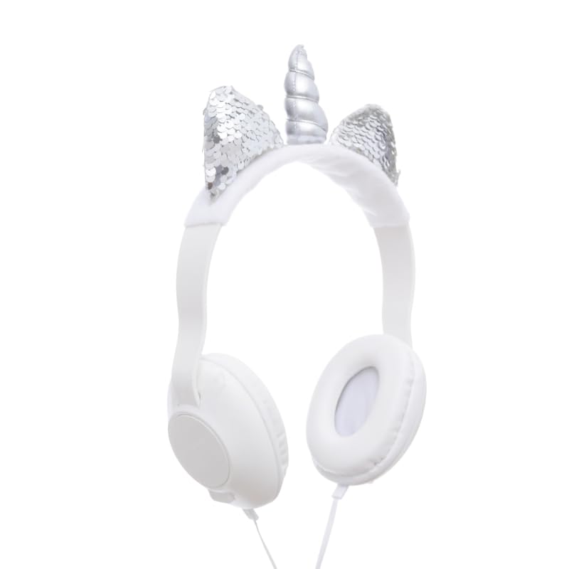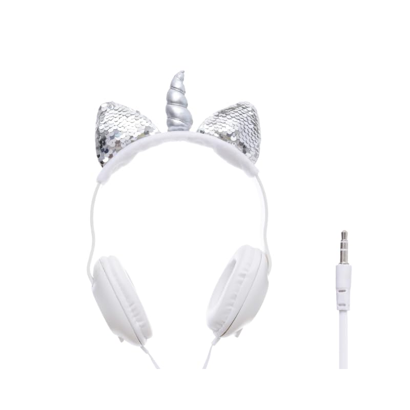 Generic - سماعة رأس ستيريو بتصميم يونيكورن بميكروفون عالي الوضوح لطيف وتتضمن كابل ايه يو اكس 3.5 ملم، مناسبة للبنات - لون أبيض وفضي