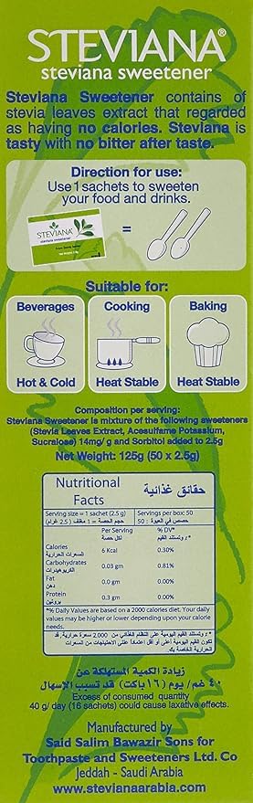 - محلي طبيعي من أوراق ستيفيا. ستيفيانا هو محلي يحتوي على ستيفيا ريبوديانا وهو عشب رائع ذو مذاق حلو يتميز بخصائص رائعة تعزز الصحة، ولا يحتوي على سعرات حرارية. لها العديد من الفوائد الصحية المواتية والمثيرة وغير سامة تمامًا.