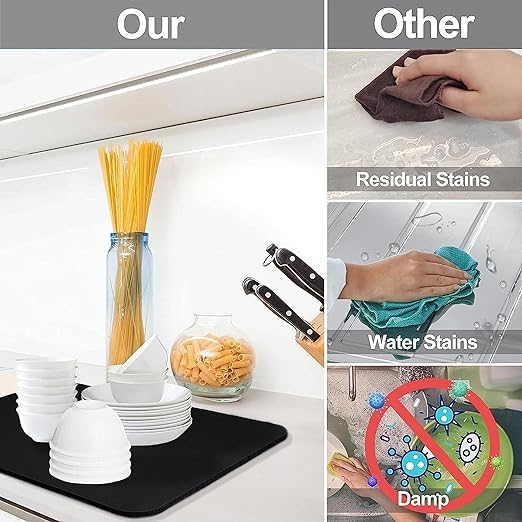 - مادة نانو فائقة الامتصاص: بساط تجفيف الأطباق الخاص بنا مصنوع من مواد فائقة الامتصاص، لتجفيف سريع لأدوات المطبخ الخاصة بك. قل وداعًا لبقع الماء والأسطح الرطبة