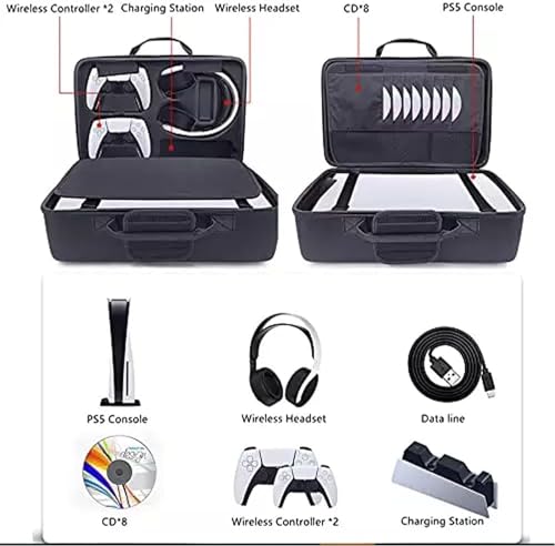 - مصمم لجهاز PS5: مصمم خصيصًا لجهاز PS5. واسعة، يمكن تخزين وحدة التحكم أو سلك طاقة التيار المتردد أو كابل USB أو سماعات الرأس أو غيرها من الملحقات.