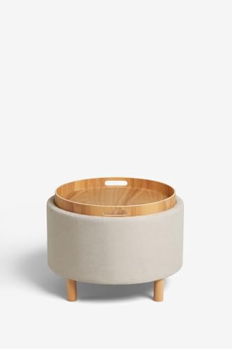 Generic - كرسي عثماني للتخزين مع صينية خشبية ، قماش بيج، أرجل خشبية، تصميم دائري حديث