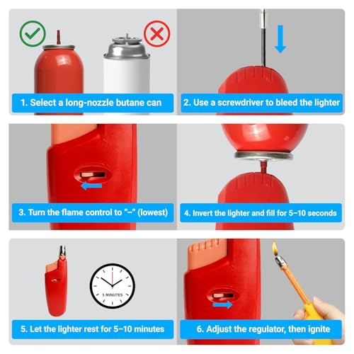- هذه الولاعات قابلة لإعادة التعبئة باستخدام علبة بيوتان قياسية ذات فوهة طويلة، مما يجعلها بديلاً مستدامًا واقتصاديًا للولاعات البلاستيكية ذات الاستخدام الواحد بمرور الوقت.