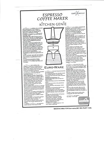 - تعليمات سهلة الاستخدام (استخدام اللغة العربية غير مؤكد): لا تستخدم في غسالة الأطباق - فك الجزء العلوي وأزل قمع الفلتر من القاعدة. املأ القاعدة بالماء العذب حتى مستوى صمام الأمان وأدخل قمع الفلتر. املأ قمع الفلتر بالبن المطحون جيدًا (لا تضغط لأسفل)، ثم ثبت الجزء العلوي بإحكام على القاعدة. مصنوعة من الألومنيوم المتين. لن تصدأ مع العناية وطرق التنظيف المناسبة. ملاحظة: اغسل الجزء الخارجي بلطف بالماء الدافئ والصابون.