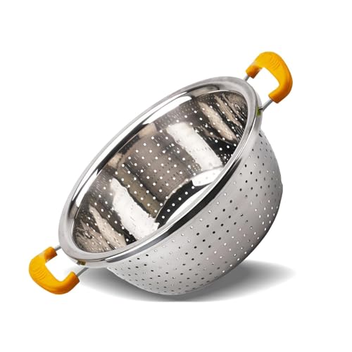 - مصنوعة من الستانلس ستيل الفاخر، تقاوم هذه المصفاة الصدأ والبقع والروائح غير المرغوب فيها، مما يضمن متانة ونظافة طويلة الأمد. لا يتأثر بدرجات حرارة الطهي العالية، مما يجعله موثوقًا بتصريف المعكرونة والأرز والخضروات المطهية على البخار وأكثر من ذلك دون القلق من التشوه أو الكسر.