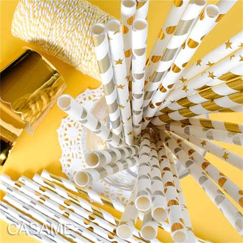 Generic - مجموعة شفاطات مشروبات - 25 قطعة من الشفاطات الورقية من رقائق الفويل المعدنية بنقشة خطوط شيفرون وأشكال قلوب ونجوم، شفاطات بلون ذهبي وفضي للحفلات والاحتفالات (100 قطعة باللون المعروض)
