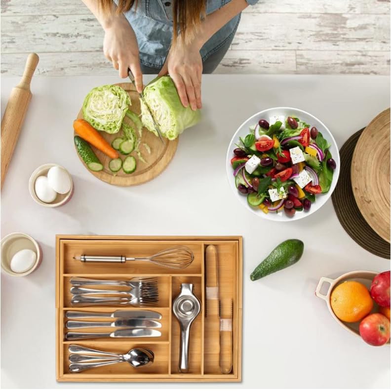 - 【بامبو طبيعي ومستدام】منظم أدوات تناول الطعام هذا مصنوع من بامبو الطبيعي، وهو مصدر متجدد ومستدام قوي وأنيق ومتين ليدوم لسنوات. لمسة نهائية آمنة غذائيًا على جميع الأسطح. منظم الأدراج المصنوع من البامبو هو بديل رائع للبلاستيك.