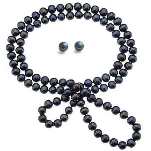 StunningBoutique - عقد لؤلؤ 5 في 1 مصنوع من مياه عذبة مستزرع مقاس 8-9 ملم 65 بوصة مع زوج الحلقان ستانينج بوتيك أسود للنساء