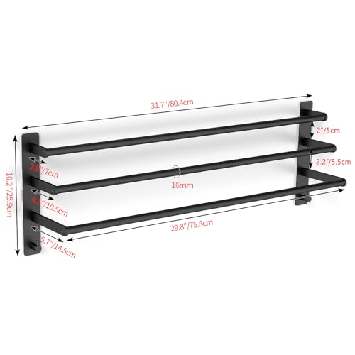- مقاس مثالي: حامل المناشف بثلاثة قضبان مقاس 31.5 × 5.7 × 10.2 انش، حامل المناشف 29.9 انش طول، 2.75 انش/4.12 انش/5.7 انش في مساحة الحائط، وهو كبير بما يكفي لتعليق العديد من المناشف السميكة في نفس الوقت، مما يسمح بمرور الهواء وتجفيف المناشف بشكل أسرع. صغير الحجم وموفر للمساحة