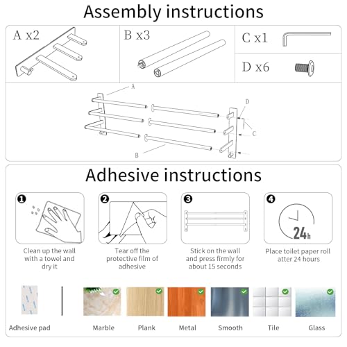 - حامل منشفة بدون ثقب: حامل المناشف ذو 3 قضبان من ستو مع قاعدة كبيرة ولاصق قوي مناسب للأسطح المسطحة والناعمة بدون غبار أو ماء، مثل البلاط والزجاج والمعدن. بدون ثقب، تركيب سريع وسهل. يرجى ملاحظة أنه غير مناسب للجدران المطلية أو الجدران المزخرفة أو ورق الحائط أو الطوب أو الأسطح غير المستوية