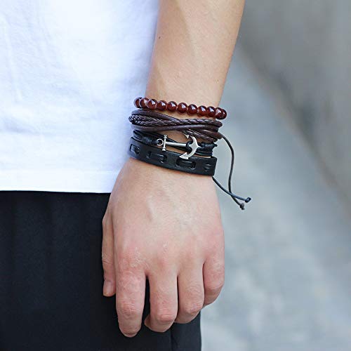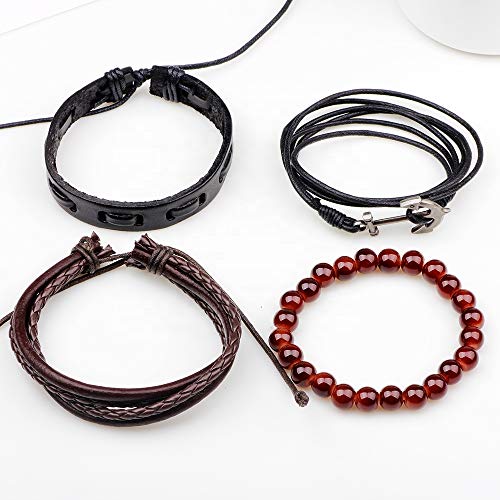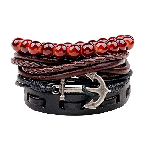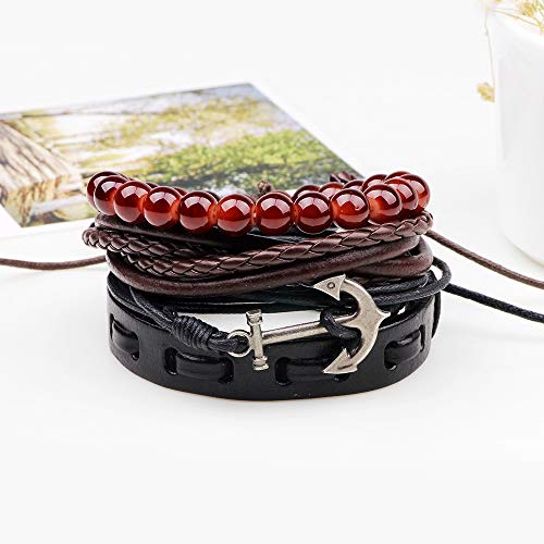 Generic - سوار جلدي مضفر متعدد الطبقات من ستايل اسنشيالز - سوار معصم مصنوع يدويا قابل للتعديل مرصع باحجار سوداء وبلون بني واحمر للرجال والنساء - هدية عيد ميلاد مثالية للرجال والنساء, One Size, جلد, حجر لافا