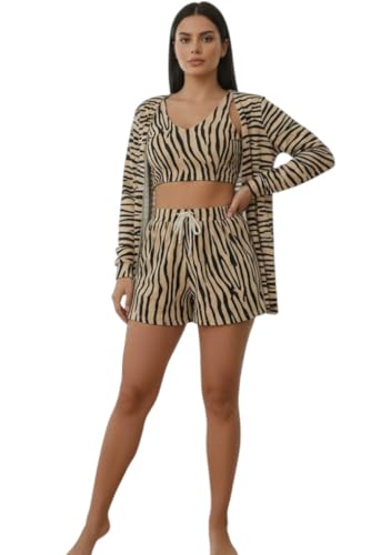 Generic - بيجامة 3 قطع أنيقة للنساء – شورت وتوب وروب – One Size عملي ودافئ