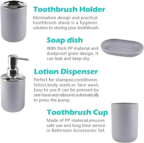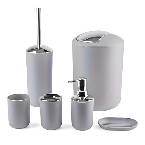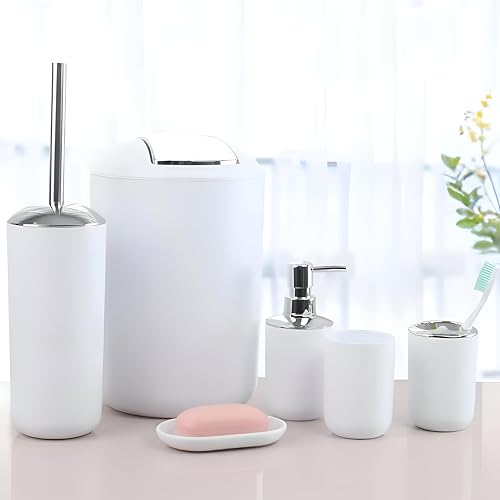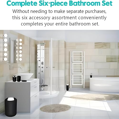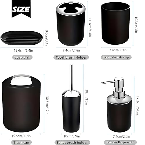 - تتضمن المجموعة المكونة من 6 قطع موزع صابون مقاوم للكسر وحامل فرشاة أسنان وسلة مهملات وحامل صابون وفرشاة تنظيف المرحاض وملحقات عملية.