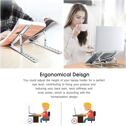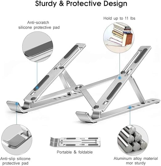 - ستاند ألمنيوم مميز بسبع مستويات – ثابت، أنيق، وسهل النقل لجميع الأجهزة