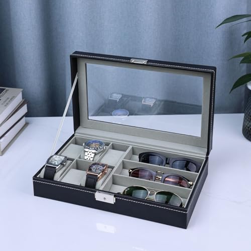 - حماية واستثمار طويل الأمد: لا يقتصر دور هذا الصندوق على التنظيم فقط، بل هو واقٍ أساسي لمقتنياتك الثمينة. البطانة الناعمة تحمي العدسات الهشة للساعات والنظارات من الخدوش، بينما يحافظ الهيكل المتين على شكلها. إنه استثمار في الحفاظ على قيمة وجمال ساعاتك ونظاراتك لفترة أطول بكثير.