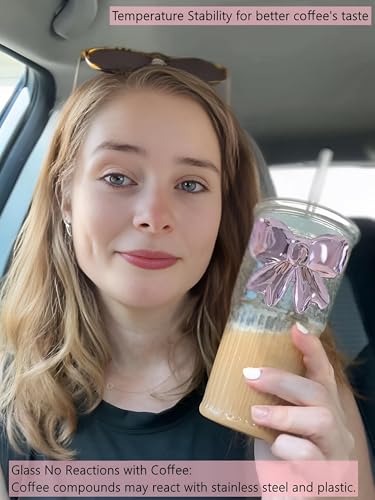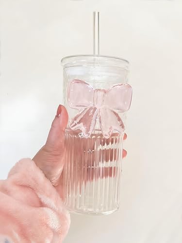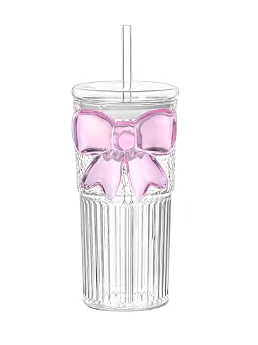 Generic - اكواب مشروبات انيقة - اكواب شفافة سعة 20 اونصة مع اغطية وماصة، مناسبة للمشروبات الساخنة او الباردة، تتميز بزخرفة فيونكة بينك، مثالية للعصائر وشاي الفقاعات وكوب السفر