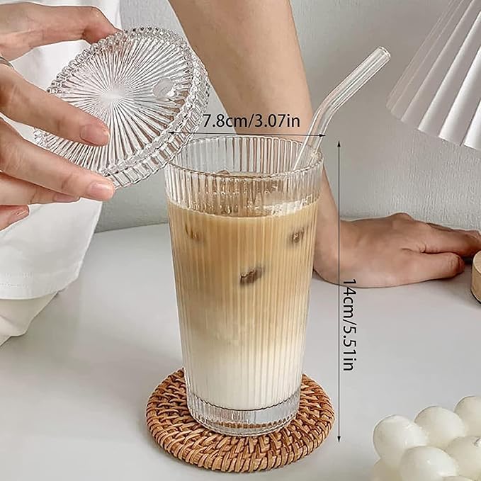 Generic - كوب زجاجي ستايلش مع غطاء وشاليمو، مخطط للقهوة المثلجة، كوب قابل لإعادة الاستخدام للعصير والشاي والماء والكوكتيلات ، ستايل فينتج للسفر للمنزل والمكتب، سعة 500 مل
