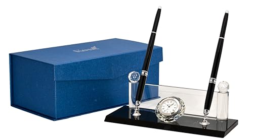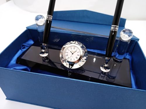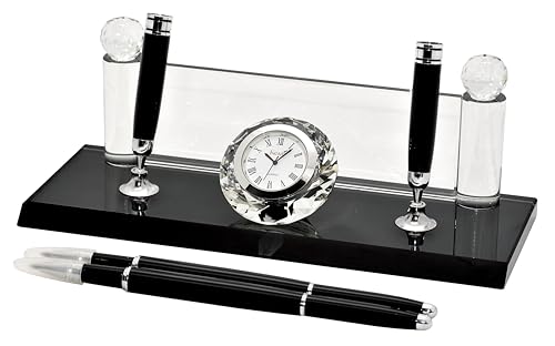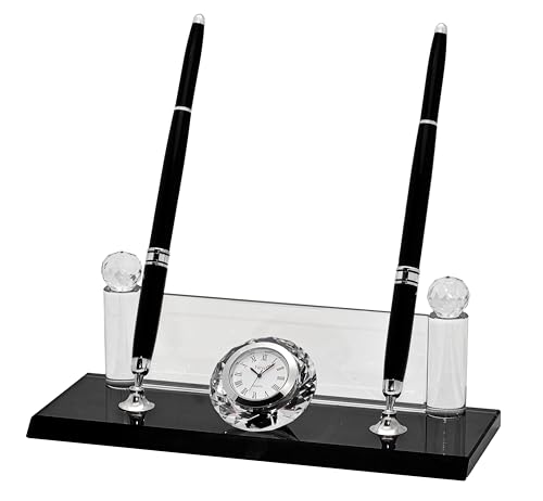 Generic - ساعة كريستال فضية اللون من ستايلو كينت مع حامل قلم معدني فضي واسود (يتضمن قلمان) - زينة ملحقات للمنزل والمكتب، تناظري