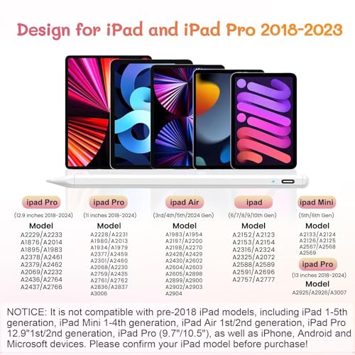 - لا يعمل مع: لا يتوافق قلم ايباد هذا مع إصدارات ما قبل 2018 من سلسلة ايباد، بما في ذلك ايباد الجيل 1-5، ايباد ميني الجيل 1-4، ايباد اير الجيل الأول/الثاني، ايباد برو 12.9 انش الجيل الأول/الثاني، ايباد برو (9.7/10.5 انش) وايفون واندرويد وأجهزة مايكروسوفت. يرجى التأكد من طراز الايباد الخاص بك قبل الشراء!