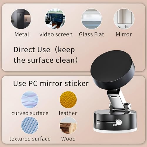 - مصمم للتشغيل بدون مجهود: ما عليك سوى تحريك المفتاح إلى "التشغيل" لتفعيل الشفط أو "الإيقاف" لتحريره على الفور - متوافق مع جميع الأسطح الملساء بما في ذلك البلاط والرخام وشاشات الفيديو، ويتضمن ملصق مرآة من البولي كربونات للأسطح المزخرفة أو المنحنية مثل الخشب أو الجلد.