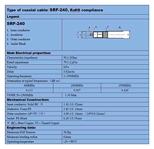 - أداء مستقر - أقصى تردد لتشغيل كابل SRF240 يصل إلى 6000 ميجاهرتز، يجب اختبار كل كابل بالكامل بواسطة محلل انريتسو ومحلل شبكة اجيلنت 8753ES قبل مغادرة المصنع لضمان أن معامل الموجة الواقفة SWR أقل من 1.15 عند 2500 ميجاهرتز، وأن خسارة الإدخال أقل من 0.463 ديسيبل/م عند 2500 ميجاهرتز.