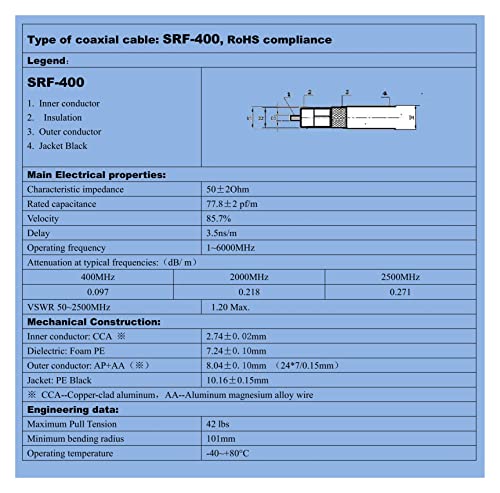 - أداء مستقر - أقصى تردد لاستخدام SRF400 يصل إلى 6000 ميجاهرتز، يجب اختبار كل كابل بالكامل بواسطة محلل انريتسو ومحلل شبكة اجيلنت 8753ES قبل مغادرة المصنع لضمان أن SWR أقل من 1.15 على 2500 ميجاهرتز وفقدان الإدخال أقل من 0.248 ديسيبل/متر على 2500 ميجاهرتز.