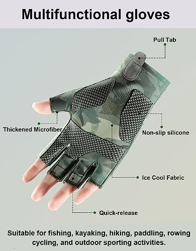 - تصميم بدون أصابع - تحافظ قفازات الصيد الخاصة بنا على القدرة على المناورة وخفة حركة يديك لتغيير الخطافات والطُعم بسهولة. هذه القفازات بدون أصابع مناسبة لصيد الأسماك، والتجديف بقوارب الكاياك، والمشي لمسافات طويلة، والتجديف، والقيادة، وركوب الزوارق، والتجديف على الألواح، والجري، وركوب الدراجات، والتخييم، والأنشطة الرياضية الخارجية.
