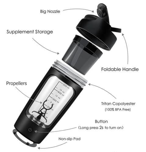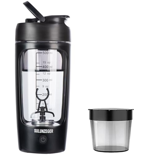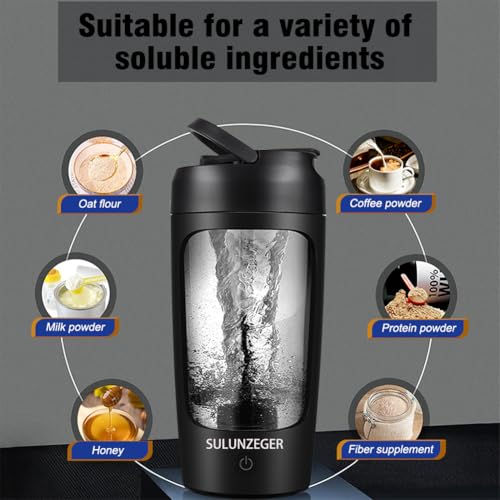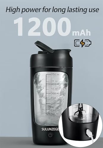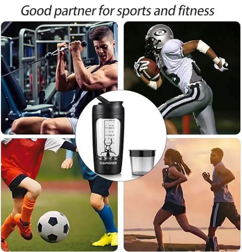 SULUNZEGER - زجاجة شيكر للبروتين كهربائية قابلة لإعادة الشحن سعة 650 مل مع كوب مسحوق، خلاط محمول، من مادة تريتان وخالي من البيسفينول أ، خلاط ما قبل التمرين لصالة الألعاب الرياضية واللياقة البدنية من سولنزيجر